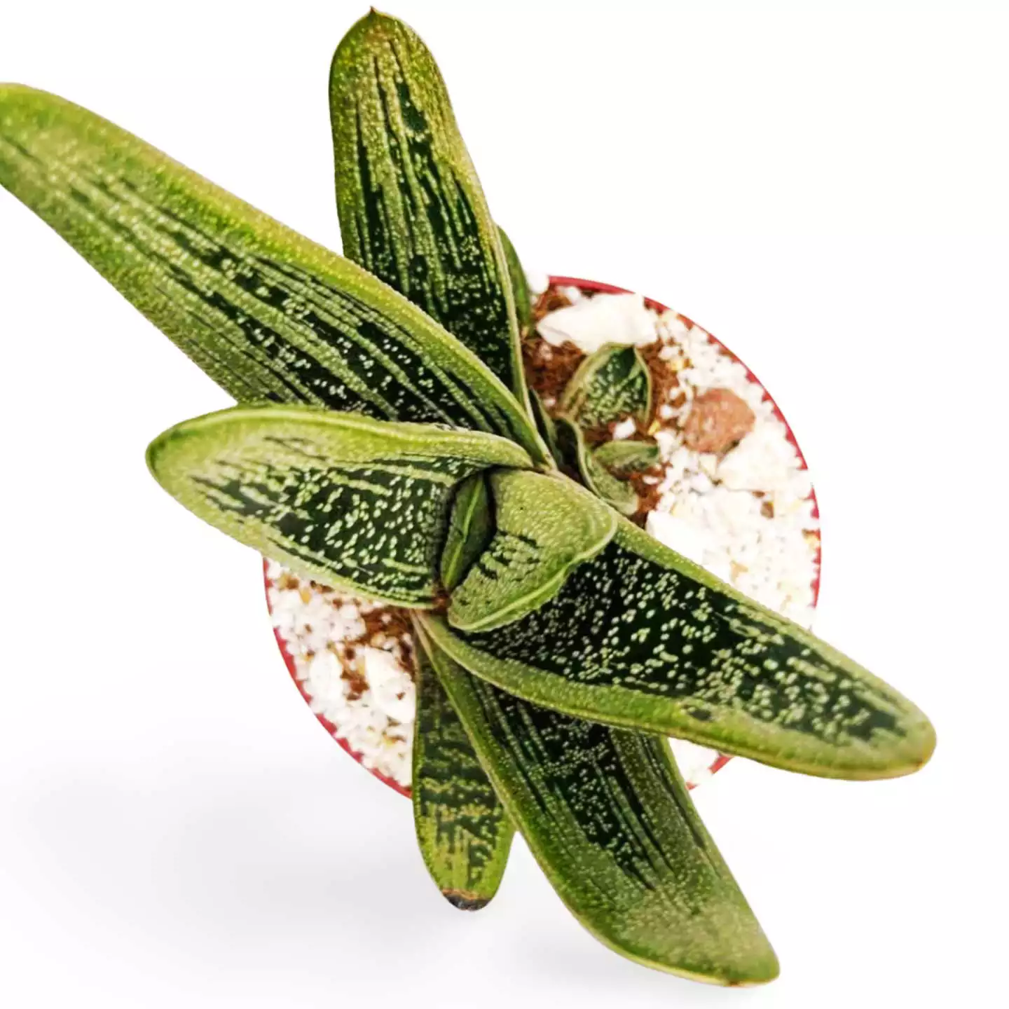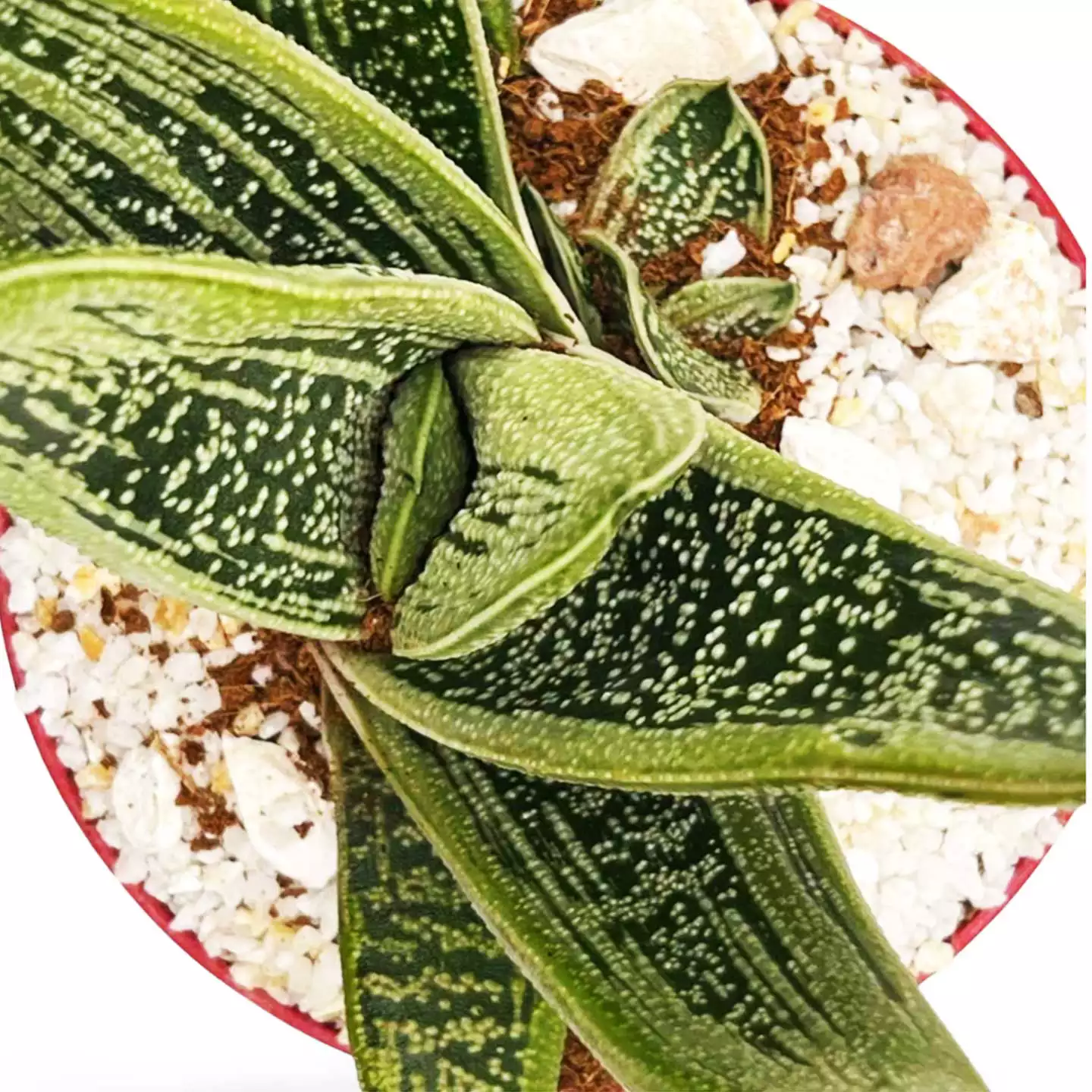 Die Gasteria ‚Little Warty‘ ist eine Hybrid-Sukkulente, die wegen ihrer charakteristischen Textur und kompakten Größe hoch geschätzt wird und sich ideal für Innenräume, Schreibtische oder helle Ecken eignet. Diese Sorte verdankt ihren eigenartigen Namen der warzigen Textur, die ihre dicken, fleischigen Blätter bedeckt, mit einem Muster aus weißen Flecken auf einem dunkelgrünen Hintergrund.